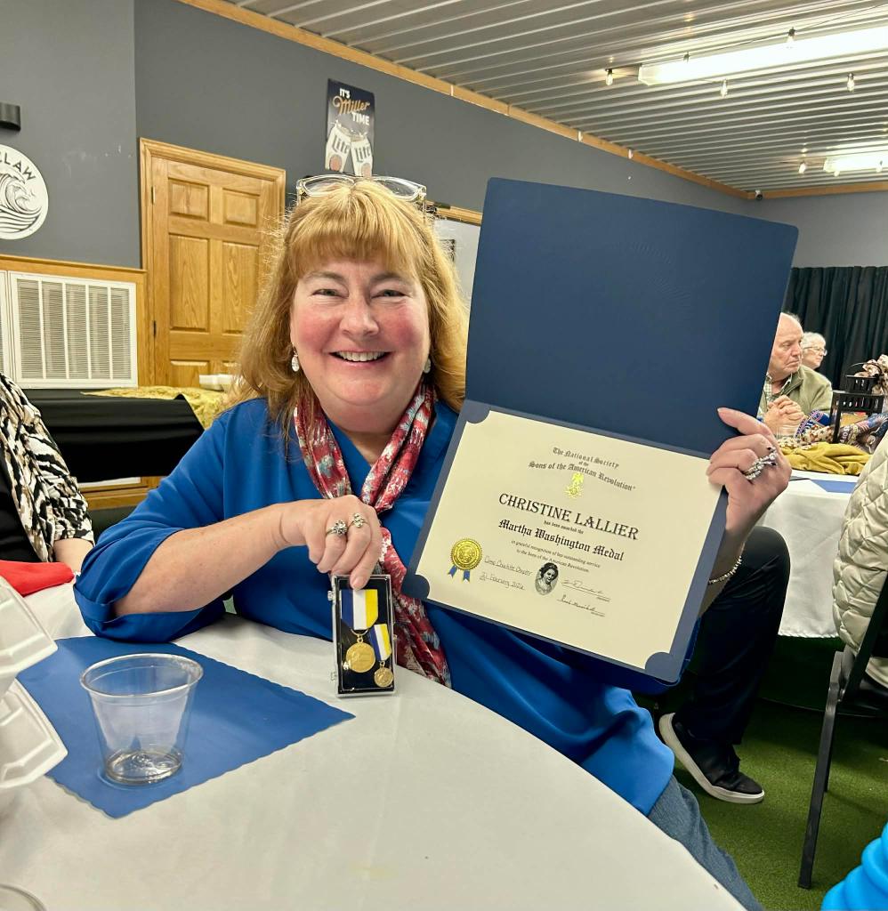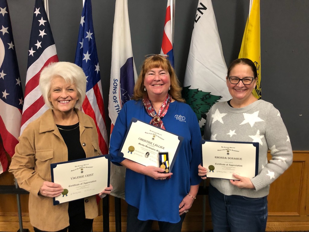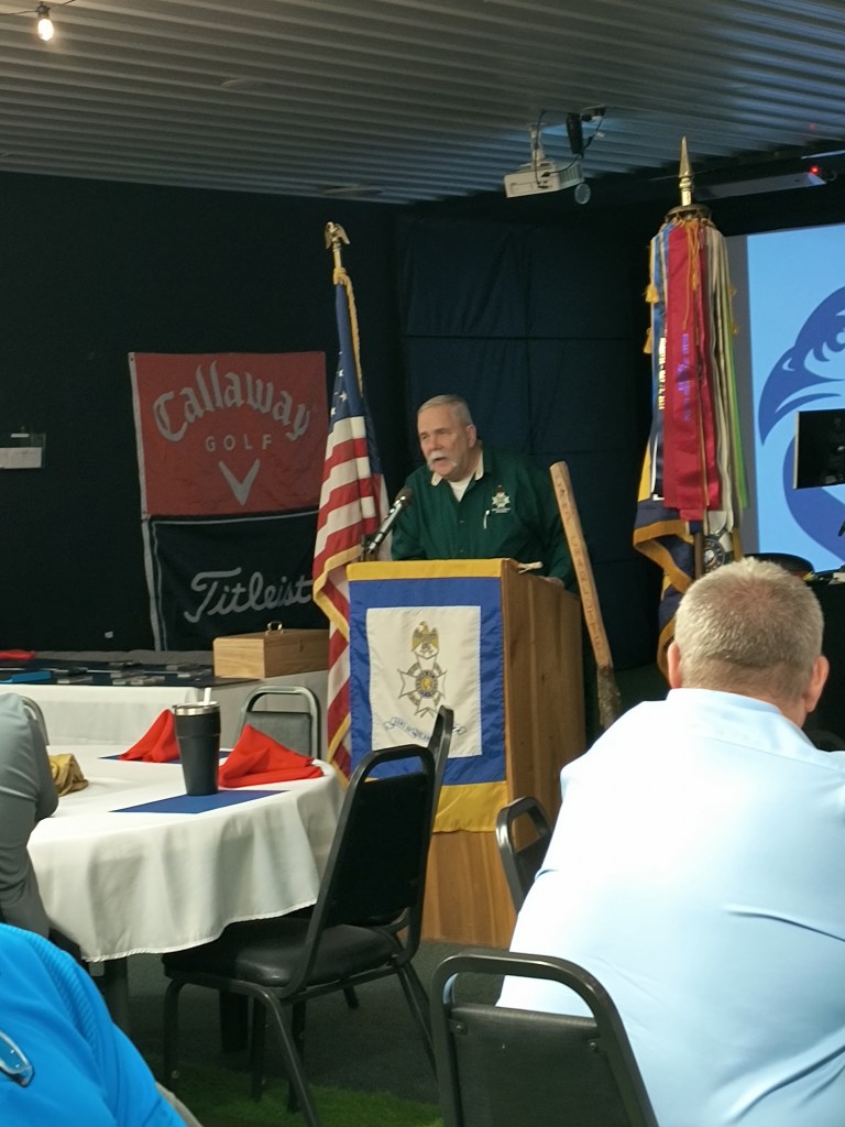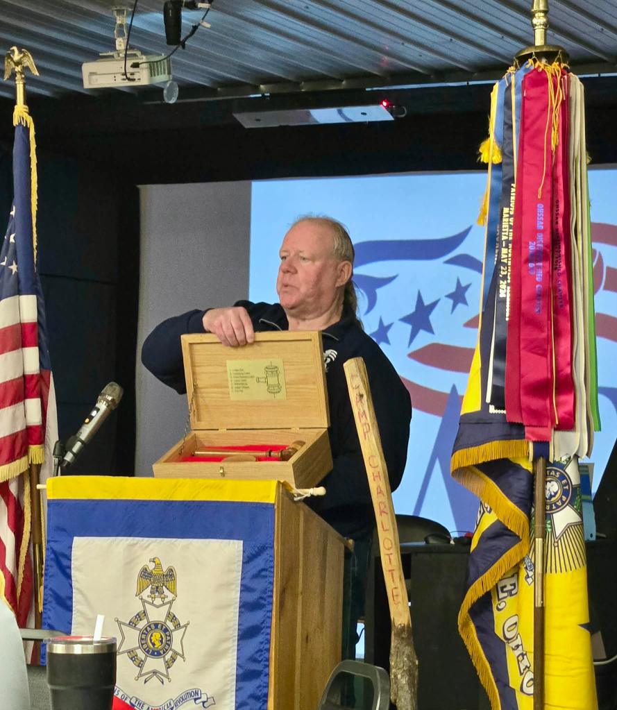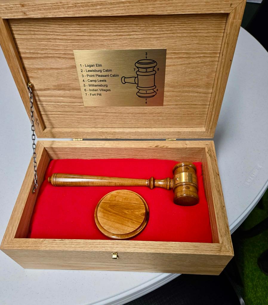February 21 2026 Camp Charlotte held their first ever Awards banquet at the Crown Hill Golf course honoring many with awards in the local community. Award of Medal of Heroism, Emergency Medical Services and many others were handed out with certificates of appreciation given to many that have helped the Camp Charlotte chapter in the past to promote the work of the SAR. Chapter President Kevin Driesbach was the host of honor for the event. A special surprise was given by Chapter member Tony Holbrook on a gavel that was made with 7 pieces of wood from various American revolutionary locations and presented to President Driesbach. Wood from all over were use to embellish the gavel even the original Logan Elm tree from which Chief Logan gave his instrumental speech and wood from the cabin at Point Pleasant are a part of this instrument.